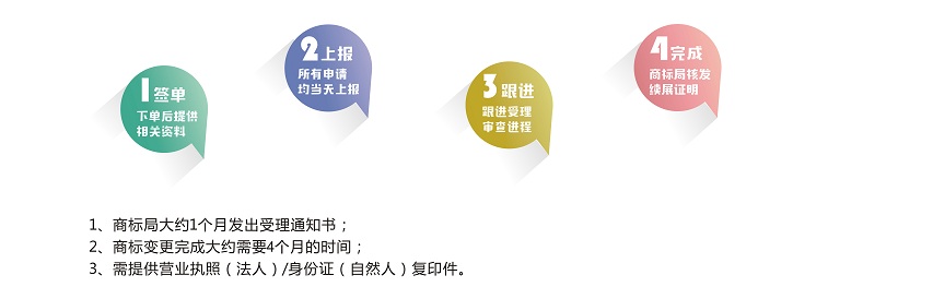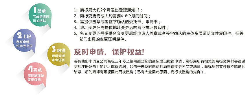 商標核準注冊后,商標注冊人的名義、地址或其他注冊事項發(fā)生變更的,應(yīng)當向商標局申請辦理相應(yīng)變更手續(xù)。變更商標注冊人名義或地址的,商標注冊人應(yīng)將其全部注冊商標一并變更。商標變更可以是已經(jīng)獲準注冊的商標,也可以是在申請中的商標。